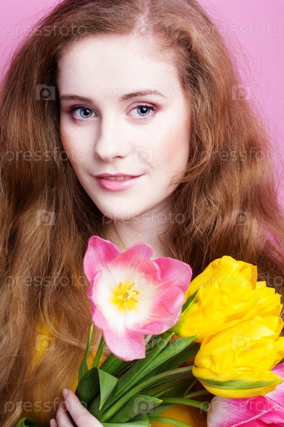 Красивая рыжая девушка с тюльпанами