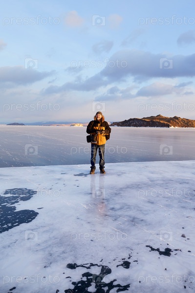 Мужчина едет по замерзшему озеру Байкал