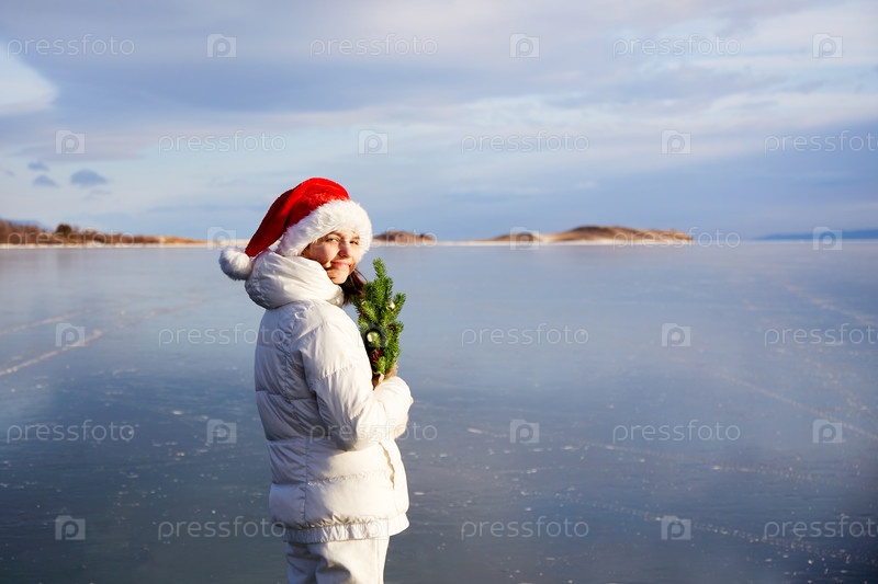 Девушка в шапке Санта-Клауса держит в руках маленькую елочку