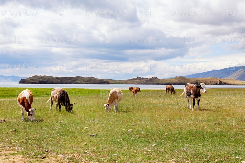 Стадо коров пасется на лугу у озера