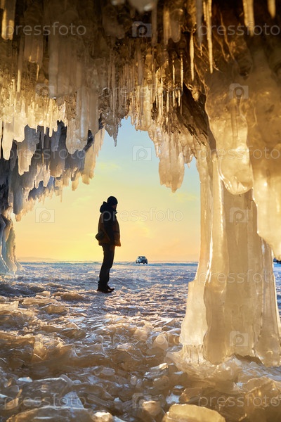 Вид из ледяной пещеры с огромными сосульками на замерзшее озеро Байкал на закате