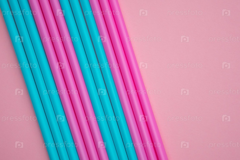 Набор синих и розовых биоразлагаемых коктейльных трубочек на розовом бумажном фоне. Абстрактный праздничный фон для дизайна