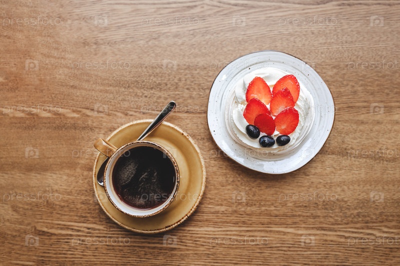 Десерт мини павлова и чашка кофе на деревянном столе в кафе, вид сверху
