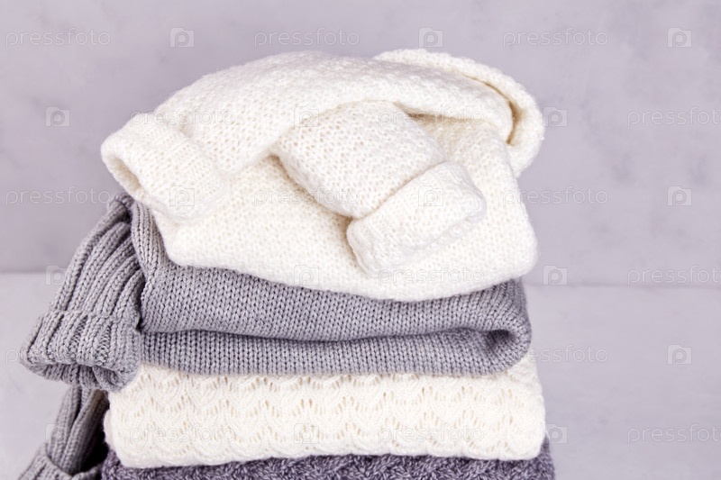 Серые и белые вязаные свитера сложены на сером фоне