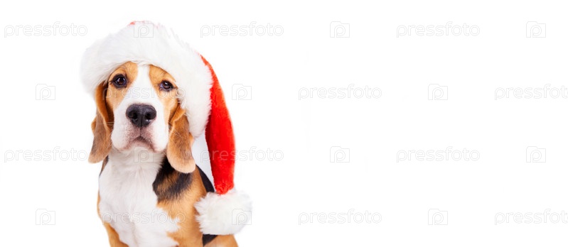 Симпатичная собака-бигль в шапке Санта-Клауса на белом изолированном фоне