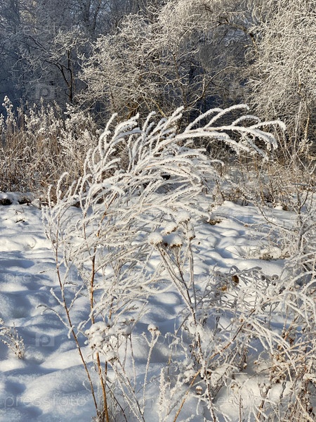 Заснеженные кусты и деревья, сугробы в зимнем парке или лесу