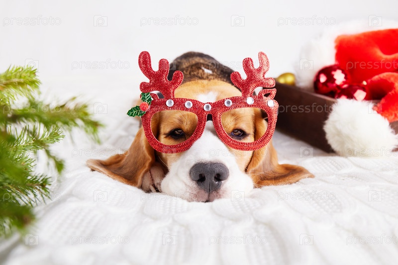 Бигль в забавных рождественских очках лежит на кровати и спит