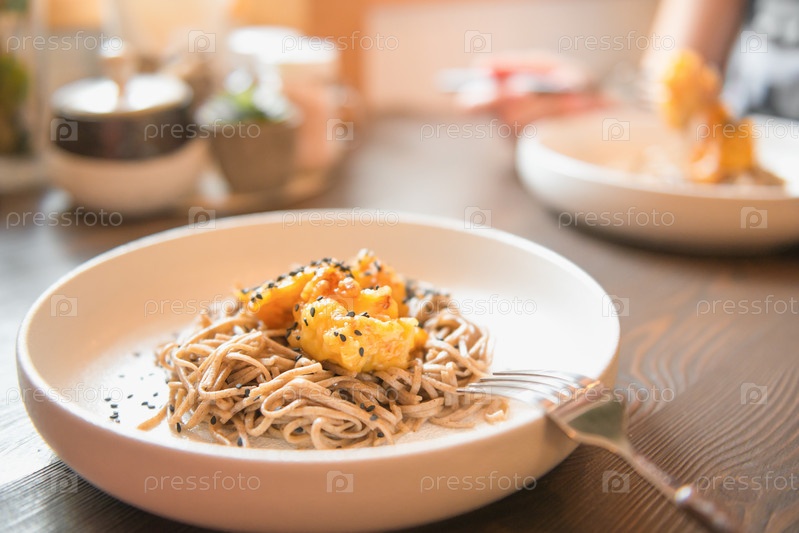 Обед в кафе. Гречневая лапша близко, выборочный фокус. Кулинария, кухня, тема натуральных продуктов