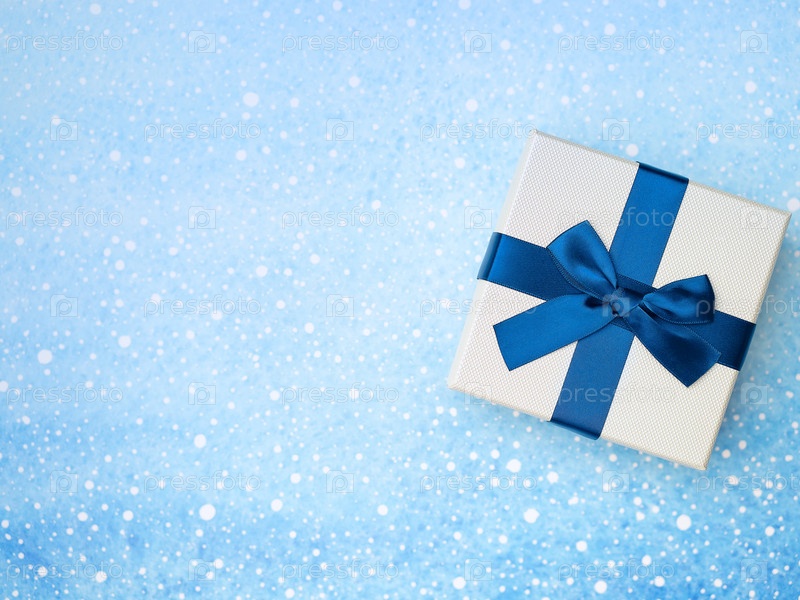Подарочная коробка с голубой лентой на фоне снега. Подарки, праздник, тема валентинок