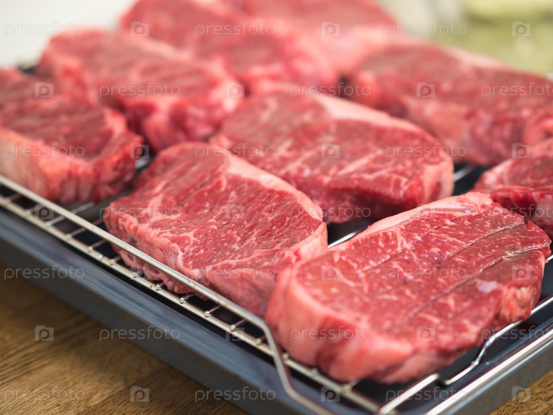 Сырые стейки на решетке, приготовленные для жарки, крупным планом, выборочный фокус