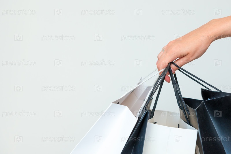 Женская рука держит черно-белые сумки на светло-сером фоне с копировальным пространством. Продажа, концепция скидки
