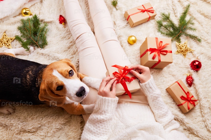 Девушка сидит на кровати и завязывает ленточку на коробке с подарком на Рождество. Рядом лежит бигль