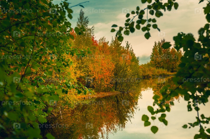Лесная река с берегами заросшего небольшого леса лиственных пород в сентябре