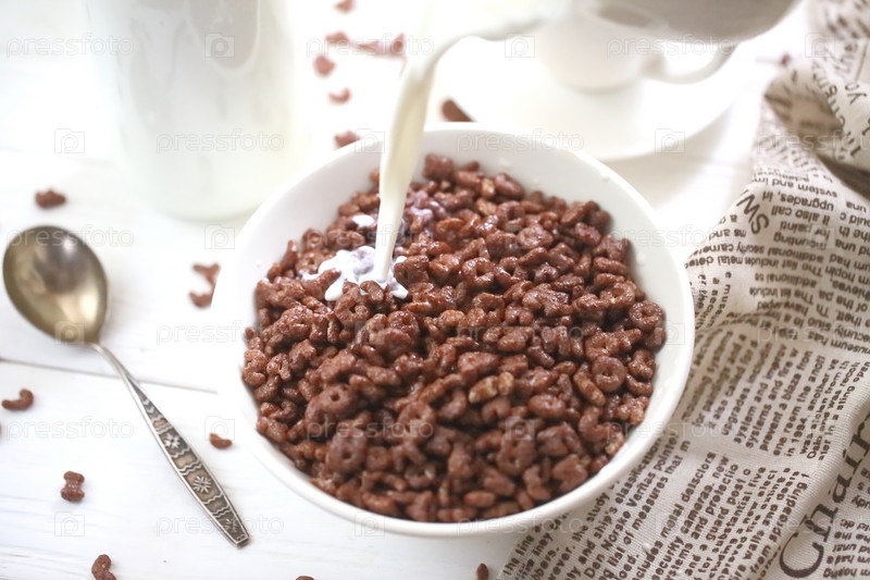 Шоколадные шарики с молоком и фруктами. Сухой завтрак