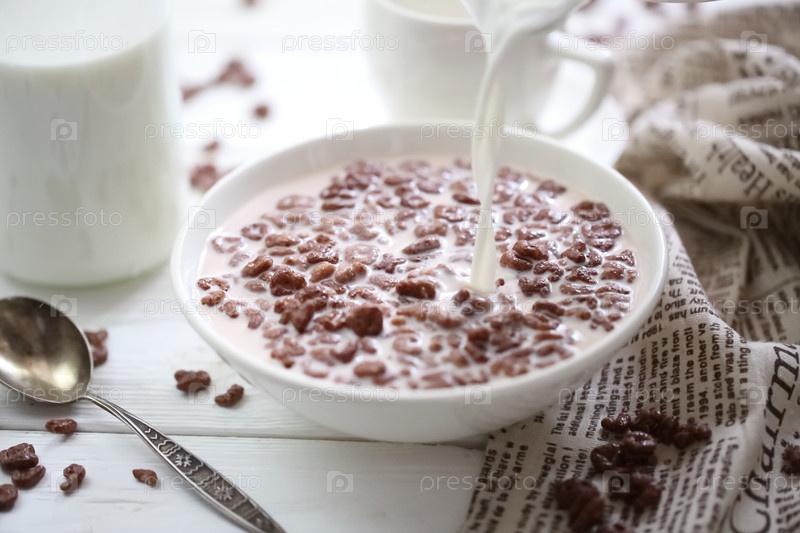 Шоколадные шарики с молоком и фруктами. Сухой завтрак