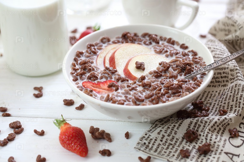 Шоколадные шарики с молоком и фруктами. Сухой завтрак