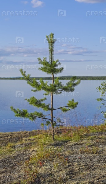 Маленькая сосна растет из трещины в гранитной скале. Беоег Канозера, река Умба, Кольский полуостров, Мурманская область. Солнечный день в августе