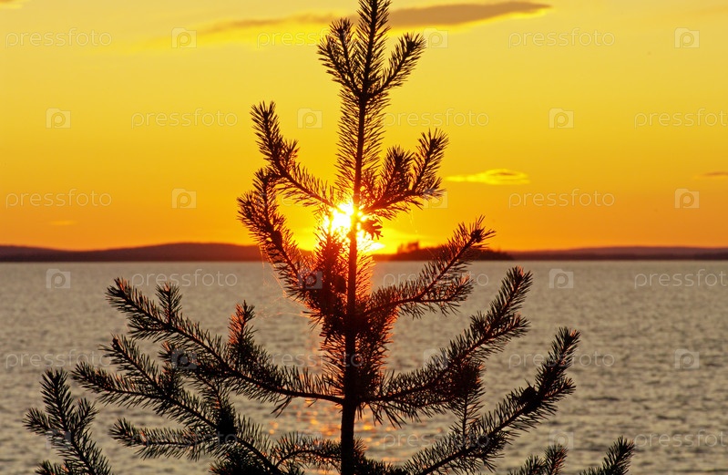 Вечер на Канозере - заходящее солнце светит сквозь небольшую сосну. Канозере. Река Умба, Кольский полуостров, Мурманская область. Август