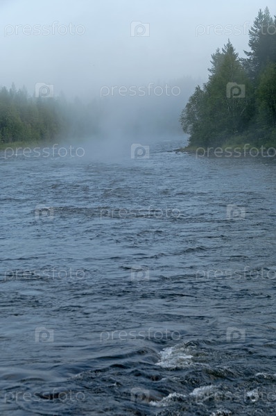 Туманное утро на северной реке. Река Умба, Кольский полуостров, Мурманская область. Солнечный день в августе