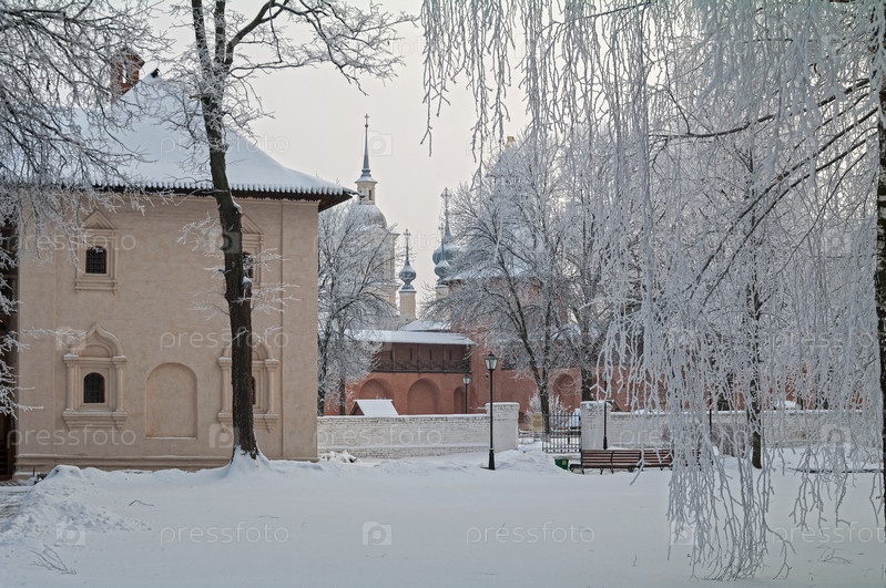 Красивые деревья с покрытыми инеем ветками на территории Спасо-Евфимиевского монастыря, Суздаль. Декабрь
