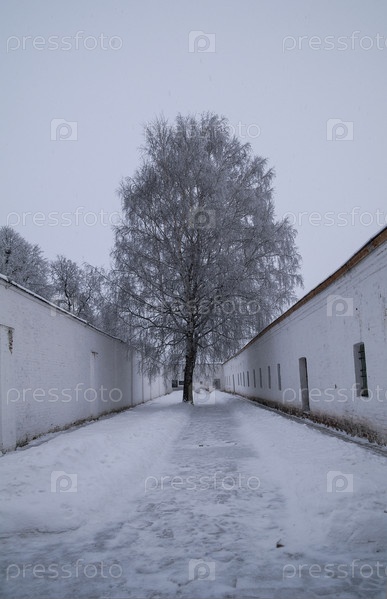 Одинокая заиндевевшая береза во дворе старой монастырской тюрьмы. Спасо-Евфимиев монастырь, Суздаль, Россия. Облачный день в декабре