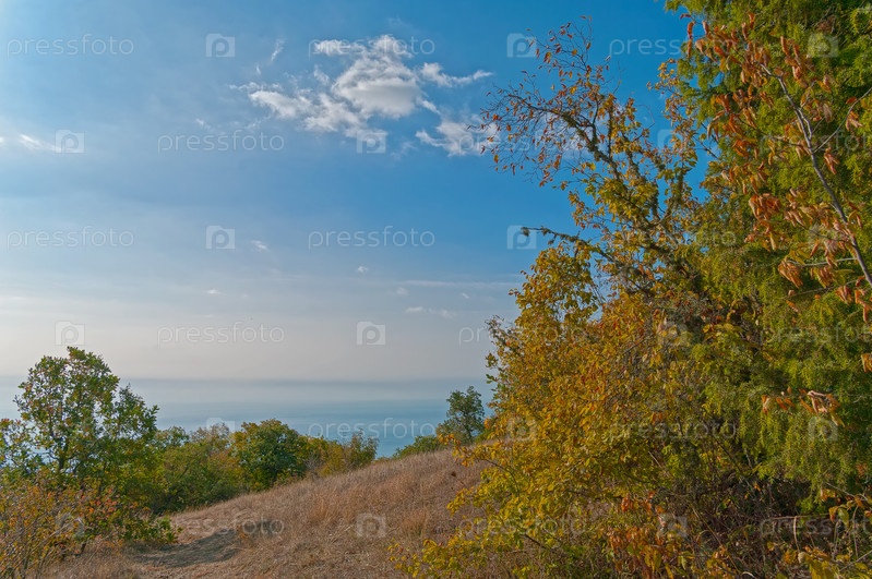 Осень в Крымских горах. Тропа на склоне горы Перчем, Судак. Солнечный день в сентябре