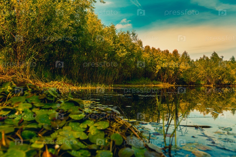 Лесная река с берегами заросшего небольшого леса лиственных пород в сентябре