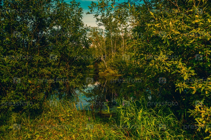 Лесная река с берегами заросшего небольшого леса лиственных пород в сентябре