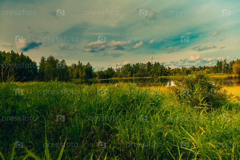 Небольшое озеро, заросшее кустарниками и травой