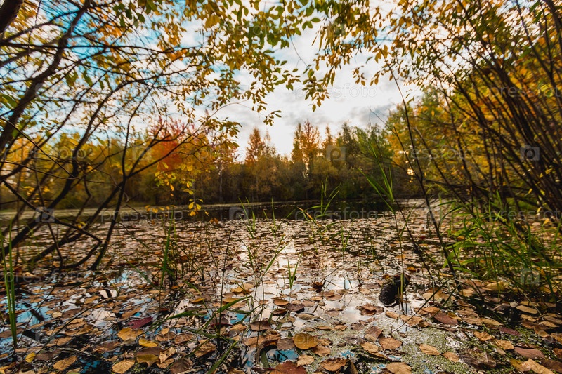 Лесной пруд, покрытый разноцветными опавшими листьями