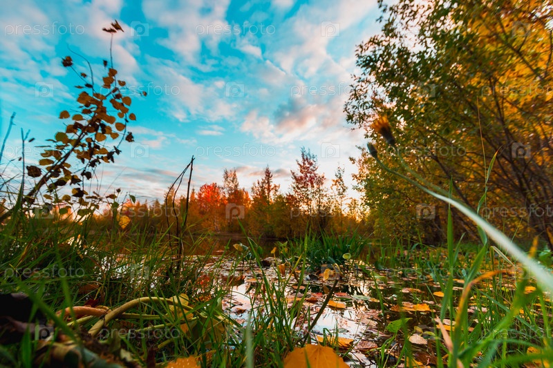 Небольшое лесное озеро, заросшее травой и покрытое опавшими листьями с деревьев
