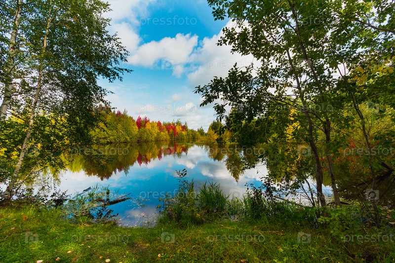 Осенний пейзаж у лесного озера в ясный день