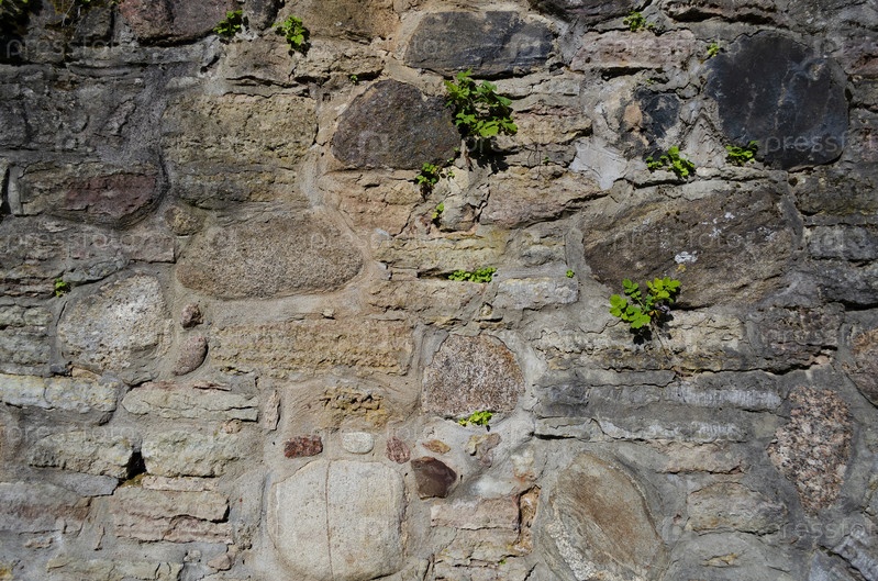 Стена выполнена из натурального известняка и круглых гранитных камней
