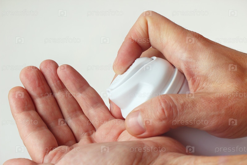 Рука мужчины выжимает пену для бритья из бутылки крупным планом