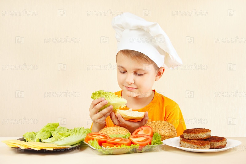 Маленький забавный шеф-повар кладет салат на бутерброд