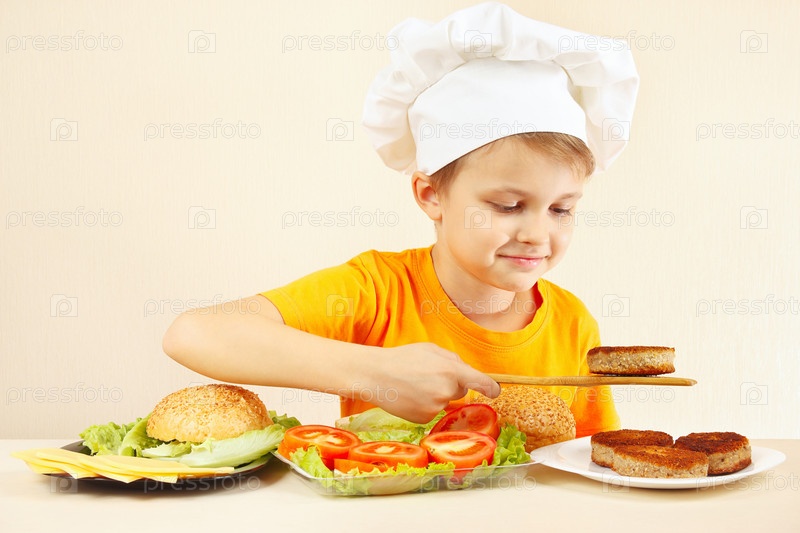 Маленький смешной шеф-повар кладет мясо на гамбургер