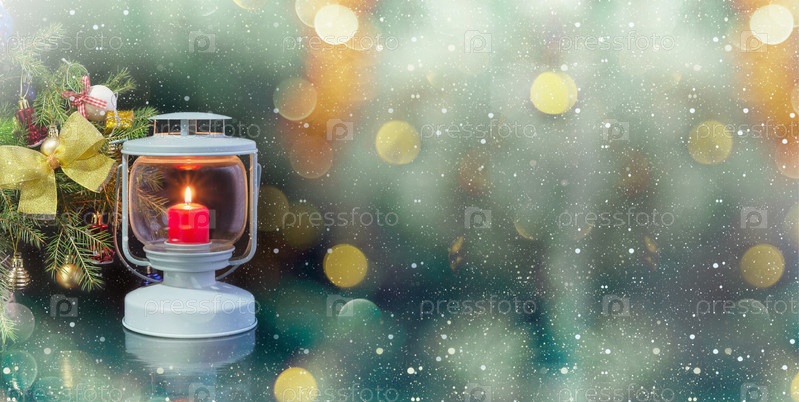 Новогодний фон с еловой веткой, украшенной горящей лампой