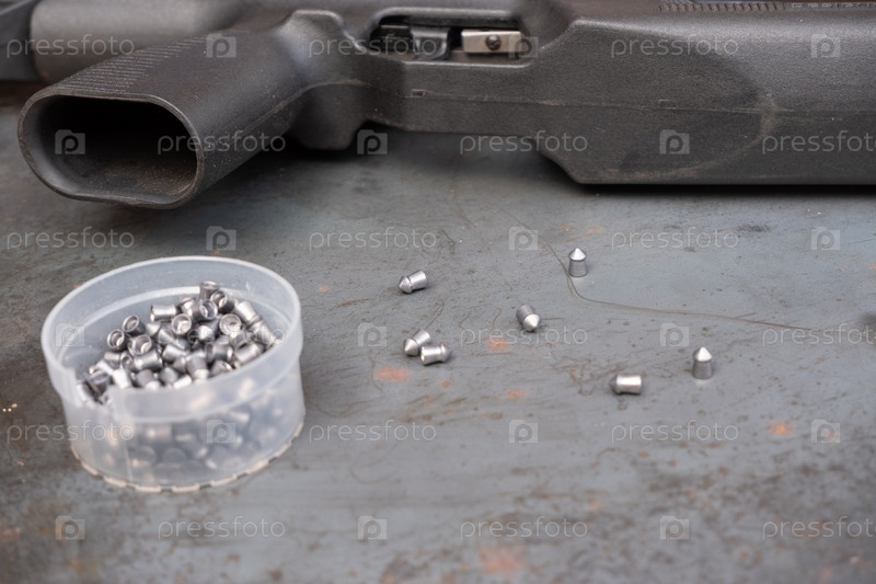 Пневматическая стрельба. пневматическая винтовка и пули на стальном столе. На фоне стали крупным планом лежит черная пневматическая винтовка, рядом разбросаны патроны