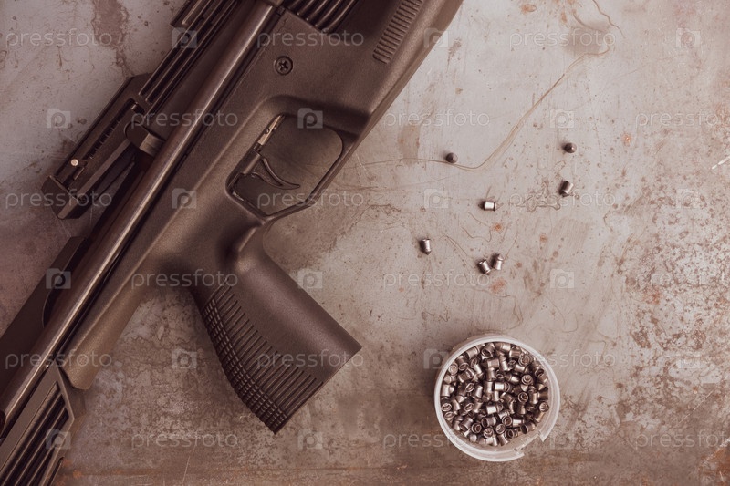 Пневматическая стрельба. пневматическая винтовка и пули на стальном столе. На фоне стали крупным планом лежит черная пневматическая винтовка, рядом разбросаны патроны