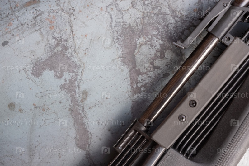 Пневматическая стрельба. пневматическая винтовка и пули на стальном столе. На фоне стали крупным планом лежит черная пневматическая винтовка, рядом разбросаны патроны