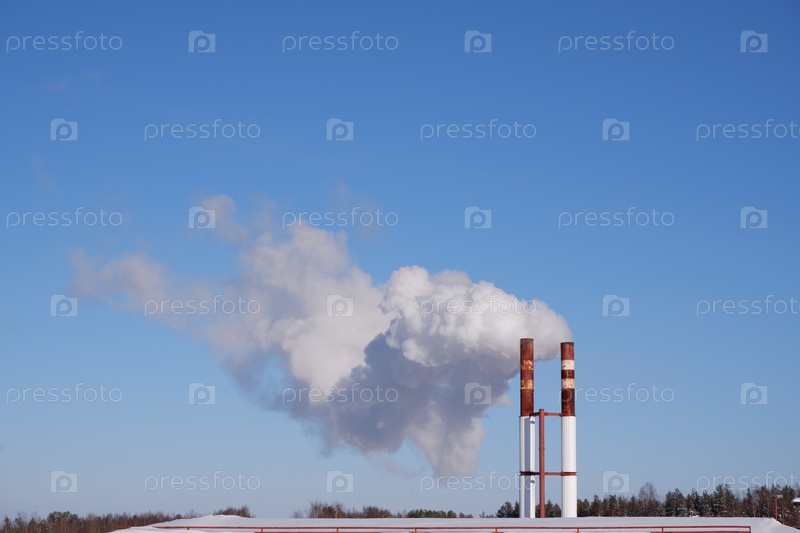Белый дым на фоне голубого неба. Клубы белого дыма из трубы