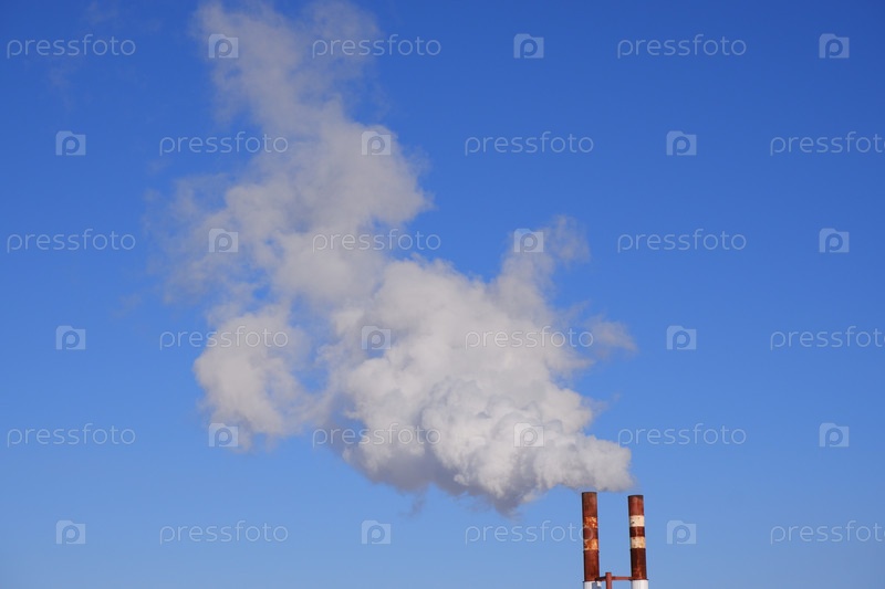 Белый дым на фоне голубого неба. Клубы белого дыма из трубы