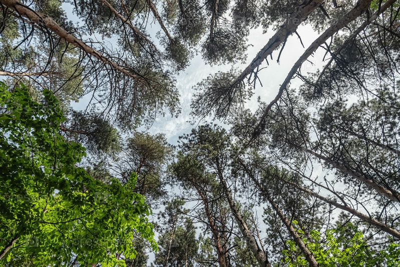 Вид снизу вверх на кроны высоких деревьев