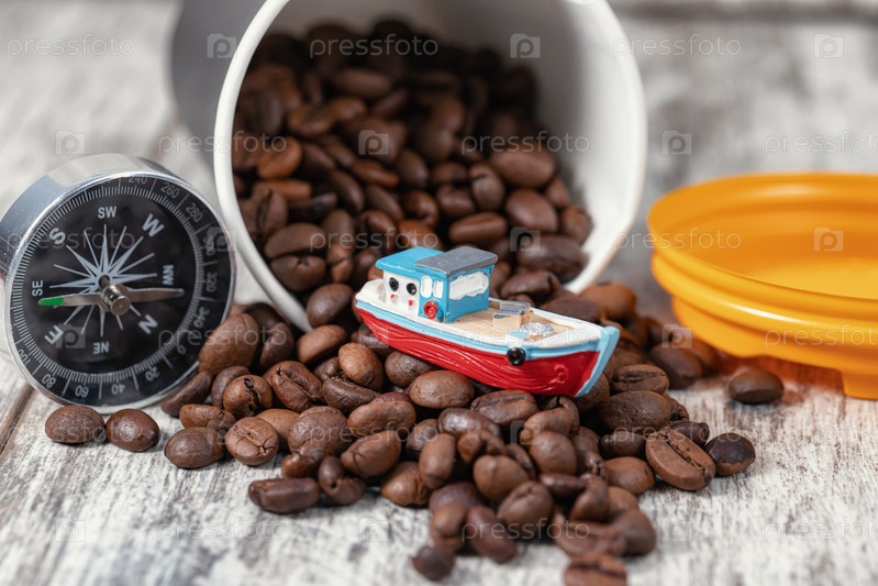 Маленький игрушечный кораблик плывет из бумажного стаканчика по волнам кофейных зерен