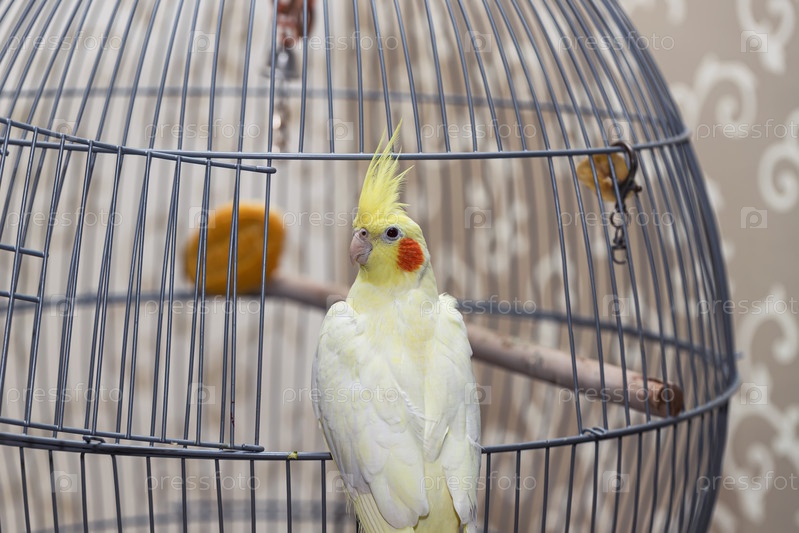 У клетки в комнате сидит желтый домашний попугай корелла