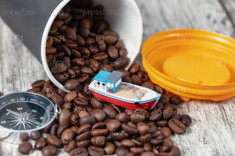 Маленький игрушечный кораблик плывет из бумажного стаканчика по волнам кофейных зерен