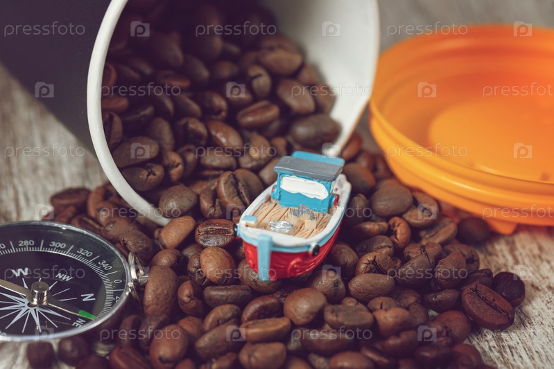 Маленький игрушечный кораблик плывет из бумажного стаканчика по волнам кофейных зерен