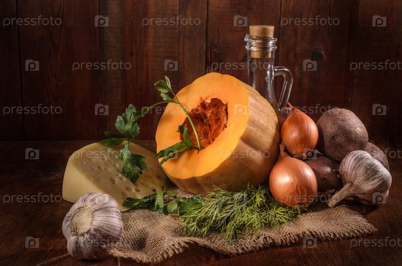 Тыква и ингредиенты для тыквенной запеканки с картофелем и сыром на темном фоне