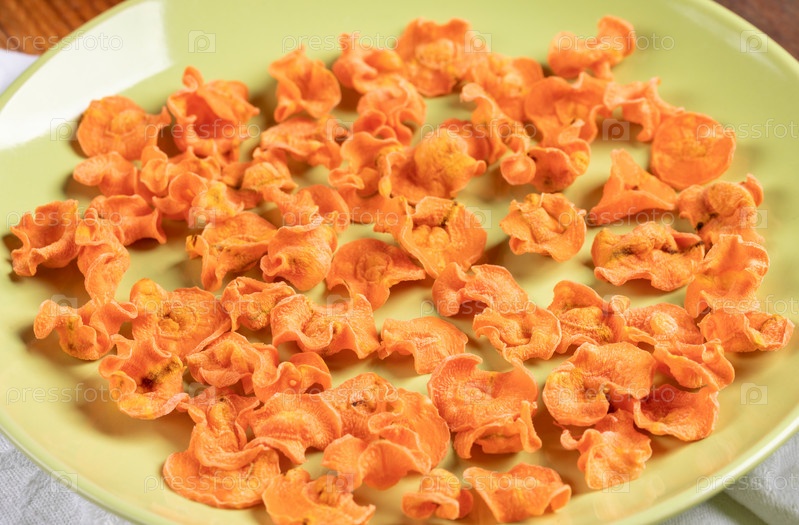 Крупным планом оранжевые домашние морковные чипсы на круглой зеленой тарелке