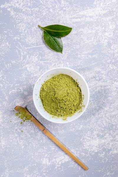 Зеленый порошок японского чая маття в белой миске, специальная деревянная бамбуковая ложка и свежие листья на сером текстурированном фоне
